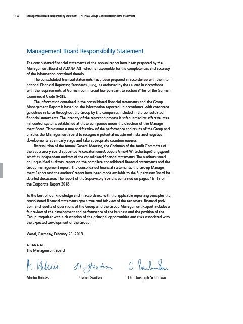 100 Management Board Responsibility Statement I ALTANA Group Consolidated Income Statement