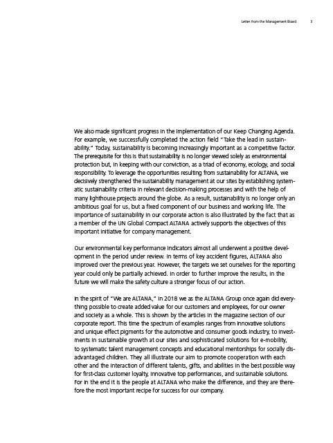 responsibility. To leverage the opportunities resulting from sustainability for ALTANA, we