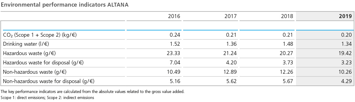 The ALTANA Group measures progress in the area of environmental protection using specific key performance indicators. In addition to the absolute values, the figures are set in relation to the quantity of produced finished goods and the gross value added. ALTANA sets annual upper limits for CO2 emissions, water consumption, and waste quantities in relation to gross value added. The development of these indicators is published in the online document “Facts and Figures on Sustainability 2019.”