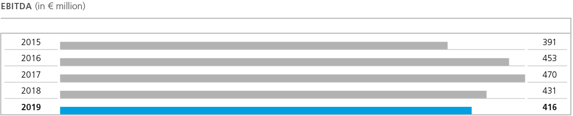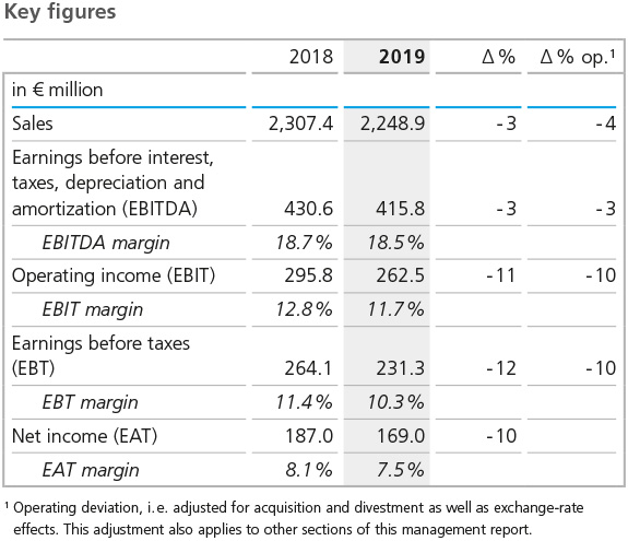 The operating sales decline was reflected by the earnings situation. Earnings before interest, taxes, depreciation and amortization (EBITDA) fell by 3 % or € 14.8 million to € 415.8 million (previous year: € 430.6 million). Since negative acquisition and currency effects had only a minor impact on earnings, the operating sales decrease adjusted for these effects also amounted to 3 %. The EBITDA margin in the 2019 fiscal year, however, at 18.5 % (previous year: 18.7 %), is once again within our strategic target range of 18 % to 20 %. This was achieved through extensive cost containment measures, which were already initiated in the fourth quarter of 2018 in view of the emerging slowdown in demand.