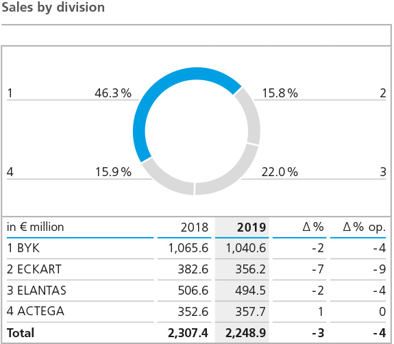 Group sales reached a total of € 2,248.9 million in 2019, a 3 % or € 58.5 million decrease compared to the previous year (€ 2,307.4 million). Non-operating effects generally had a positive effect on the sales development. Exchange-rate changes, primarily from the changed relations of the euro to the U.S. dollar, resulted in a sales increase of 1 %. Due to the acquisition of the business of Paul N. Gardner in the U.S. (BYK division) in mid-2019, Group sales increased by € 4.1 million. Adjusted for these currency and acquisition effects, Group sales were 4 % below the previous year.