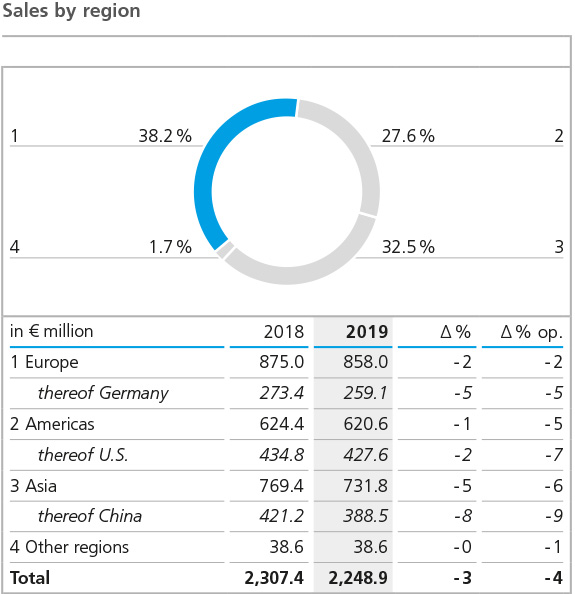 In 2019, sales in the Americas lagged slightly behind the previous year’s level. Adjusted for positive exchange-rate and acquisition effects, operating sales decreased by 5 %. Sales in the U.S. – still ALTANA’s largest single sales market, accounting for 19 % of total sales – fell by 7 % in operating terms. A major reason for this decline was a reduction in exploration activities. As a result of the lower average crudeoil price level over the year, the development of new production sources in the U.S. declined, and so demand for the corresponding special products of the BYK division fell significantly compared to the previous year. In Brazil and other major Latin American markets, however, operating sales grew slightly vis-à-vis the previous year. Overall, the Americas’ share of Group sales increased slightly to 28 % (previous year: 27 %). Asia continued to account for 33 % of Group sales in the past fiscal year. In operational terms, however, sales did not reach the level of 2018, down by 6 %. The significantly weaker economic growth in China, in particular, resulted in a decrease in demand for the Group’s products and services in the region. With a sales share of 17 % (previous year: 18 %), China remains ALTANA’s second largest market.