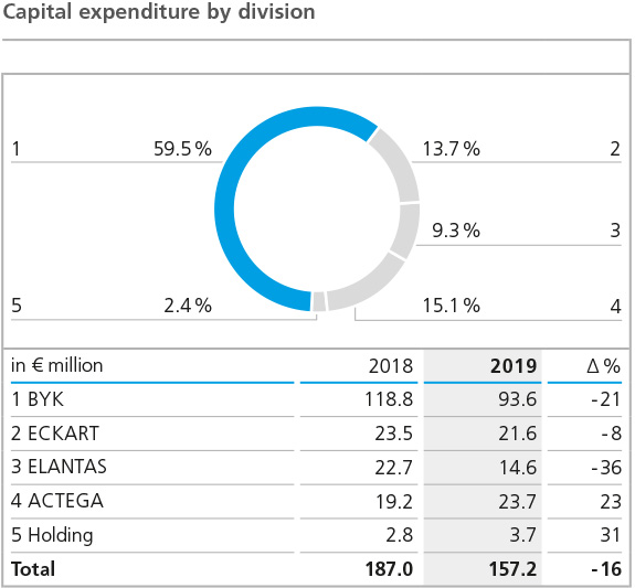 In 2019, the BYK division invested a total of € 93.6 million, less than in the previous year (€ 118.8 million). As in 2018, the investment activity focused on the expansion of manufacturing capacities for rheology additives in the U.S. and on a site in China. In addition to research and development capacities at various locations, other investments related to a facility for carrying out automated product tests on additives at the Wesel site and strategic digitalization projects.