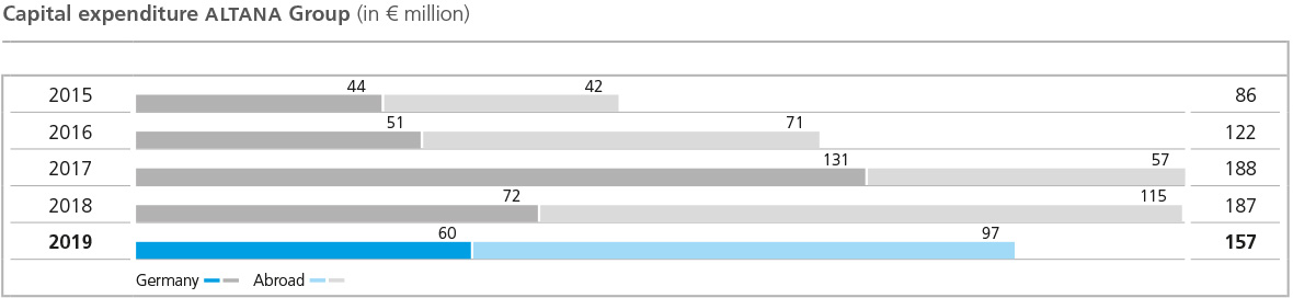 In the past fiscal year, ALTANA invested a total of € 157.2 million in intangible assets and property, plant and equipment (excluding the addition of rights of use from leasing agreements). As a consequence, capital expenditure was significantly below the high level of the previous year (€ 187.0 million). At 7.0 %, the investment ratio, that is the ratio of investments to sales, was above our long-term target range of 5 % to 6 % due to numerous strategic growth projects.