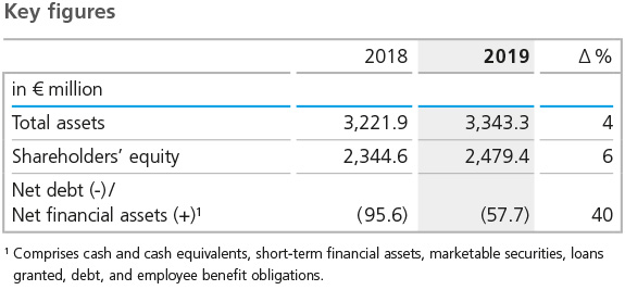 On the liabilities side, changes arose primarily due to the earnings-related increase in equity. Group equity rose by € 134.8 million, or 6 %, to € 2,479.4 million (previous year: € 2,344.6 million). The increase is attributable to the surplus in the 2019 financial year and, to a lesser extent, to positive effects of exchange-rate fluctuations. The revaluation of net pension obligations had a counteracting effect. The equity ratio rose to 74 % on December 31, 2019 (previous year: 73 %).