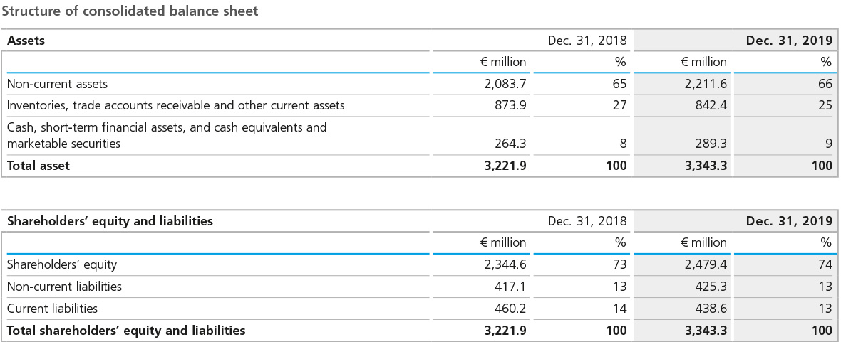 Intangible assets fell slightly to € 1,023.9 million (previous year: € 1,044.2 million). There were no business combinations or technology acquisitions with a significant impact on intangible assets in the past fiscal year. In contrast, there was a significant increase in property, plant and equipment, which rose further from € 868.2 million to € 970.8 million. With additions of € 146.9 million, the level of investment in property, plant and equipment was significantly higher than depreciation and amortization (without taking into account the addition of right-of-use assets from leasing agreements). Exchange-rate effects also led to an increase in carrying amounts in the Group currency, the euro. On December 31, 2019, non-current assets totaled € 2,211.6 million (previous year: € 2,083.7 million), € 127.9 million up on the previous year. Their share in total assets increased slightly to 66 % (previous year: 65 %).