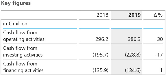 Cash flow from investment activities rose to € 228.8 million (previous year: € 195.7 million). Although investments in intangible assets and property, plant and equipment were at a lower level than in the previous year, the repayment of a loan of € 71.0 million was made in the previous year and expenditure on acquisitions in 2019 was higher than in the previous year.