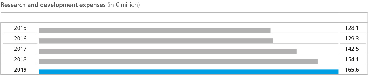The basis for our innovative strength is an open and dynamic corporate culture that gives the 1,174 employees in our research and development centers around the world the freedom to act creatively and entrepreneurially. The equipment in our development centers enables our employees to implement their ideas in marketable solutions. In the year under review, expenses for research and development amounted to € 165.6 million, a significantly higher amount than in the previous year (€ 154.1 million). The further increase in research and development expenses to 7.4 % of sales (previous year: 6.7 %) is linked to the achievement of important milestones and the translation of individual customer requirements into future, innovative products.