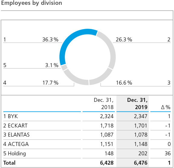 Staff numbers of the Group holding companies climbed by 54 to 202 in the past fiscal year (previous year: 148). This is mainly due to the expansion of the activities of the service company implemented in the previous year at the holding level (+ 38 employees). In 2019, the holding company took over the financial accounting and general administration functions for the Wesel site as well as an SAP Competence Center. The staff had previously been employed in the BYK division.