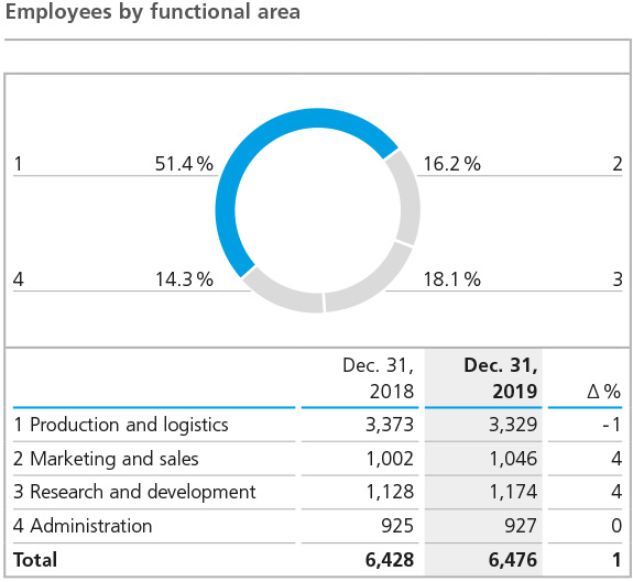 The functional structure of the workforce did not alter significantly in the 2019 fiscal year. With 51 %, or 3,329 people (previous year: 3,373), most of the employees continued to work in production, although this was the only area in which staff numbers declined in the course of the year due to lower capacity utilization. In contrast, the number of people working in research and development increased by 46 to 1,174 in 2019 (previous year: 1,128). The number of employees in marketing and sales also increased, by a total of 44, in the course of 2019. As in previous years, administrative functions continued to account for the smallest share of the Group-wide workforce, with 927 employees (previous year: 925). The number of employees in this area remained virtually unchanged over the course of the year.