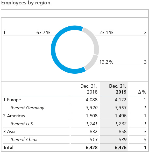 In 2019, there were only minor shifts in the regional structure compared to the previous year. With 4,122 employees (previous year: 4,088), the European Group companies continued to employ by far the largest number of people. 3,353 (previous year: 3,320) were employed in Germany at the end of the year, the majority of them at ECKART’s and BYK’s largest production sites, in Hartenstein and Wesel, respectively. The number of employees in the Americas fell slightly by 12 from 1,508 in the previous year to 1,496 at the end of 2019 despite the acquisition of the business activities of Paul N. Gardner. By contrast, the number of employees in the Asian Group companies rose from 832 in the previous year to 858 in 2019, the largest percentage increase.