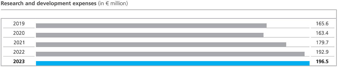 The basis for our innovative strength is an open and dynamic corporate culture that gives the 1,265 employees in our worldwide research and development centers freedom for creative and entrepreneurial action. The equipment in our development centers enables our employees to turn their ideas into market ready solutions. Our research and development expenses increased by € 3.6 million to € 196.5 million compared to the previous year (€ 192.9 million). The increase in the proportion of sales accounted for by research and development expenses to 7.2 % (previous year: 6.4 %) is mainly due to the demand driven decline in sales. In general, our expenditures are related to the achievement of important milestones, the implementation of individual customer requirements in future innovative products, and the long-term orientation of our innovation activities.
