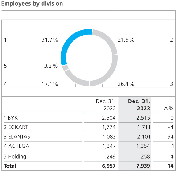 At the end of 2023, the companies of the ALTANA Group employed 7,939 people worldwide (previous year: 6,957). The increase of 982 employees, or 14 %, compared to the previous year was almost exclusively due to the acquisition of the Von Roll Group in September 2023, in which we took over 982 employees.