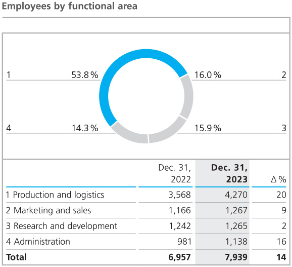 The functional structure of the workforce changed slightly in the 2023 financial year due to the acquisition of the Von Roll Group. With 54 % or 4,270 people (previous year: 3,568), the proportion of employees in production increased, including 725 people due to the acquisition of the Von Roll Group. The number of people employed in research and development rose by 23 to 1,265 employees in 2023 (previous year: 1,242), 47 of whom came from the acquisition of the Von Roll Group. In marketing and sales, the headcount rose by a total of 101 to 1,267 in 2023 (previous year: 1,166). Here, 105 employees were taken over from the Von Roll Group. Administration comprised 1,138 employees in the reporting year (previous year: 981); the increase of 157 people is also mainly due to the acquisition of the Von Roll Group (105 people).