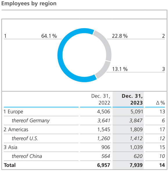 There were only minor shifts in the regional structure in 2023 compared to the previous year. With 5,091 people (previous year: 4,506), the European Group companies continued to account for by far the largest share of the workforce. 3,847 employees (previous year: 3,641) were employed in Germany at the end of the year, most of them at the largest production and development sites of the ECKART and BYK divisions, in Hartenstein and Wesel respectively. The inclusion of the Von Roll companies augmented the number of employees in Switzerland by 213. The workforce in the Americas rose by 264 to 1,809 at the end of 2023 (previous year: 1,545). The increase was primarily attributable to the Von Roll Group’s North American and Brazilian companies. The number of employees working for the Asian Group companies grew from 906 in the previous year to 1,039 in 2023, with the headcount in China and India increasing the most due to the new Von Roll companies.