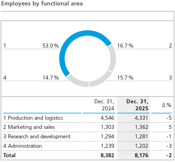 The functional structure of the workforce changed only marginally in the 2025 fiscal year. The proportion of employees in production decreased to 53 % (4,331 employees; previous year: 4,546), of which 213 were attributable to the divestments in the ELANTAS division. The number of employees in research and development decreased in 2025 by 13 to 1,281 employees (previous year: 1,294). In marketing and sales, the headcount increased during 2025 by 59 to 1,362 employees (previous year: 1,303). Administration comprised 1,202 employees in the reporting year (previous year: 1,239), a decrease of 37 employees.
