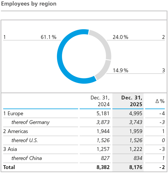 In terms of regional structure, there were slight shifts from Europe to the Americas in 2025 compared to the previous year, primarily due to the divestment of ELANTAS business activities in the context of the Von Roll integration. European Group companies continued to account for by far the largest share of the workforce. The number of employees declined by 186 to 4,995 (previous year: 5,181). At the end of the year, 3,743 employees (previous year: 3,873) were based in Germany, with the majority working at the largest production and development sites of the ECKART and BYK divisions in Hartenstein and Wesel, respectively. In the Americas, the number of employees increased by 15 to 1,959 at year-end 2025 (previous year: 1,944). The workforce in Asia decreased by 35 employees, from 1,257 in the previous year to 1,222 in 2025, mainly attributable to the sale of Von Roll India business activities.