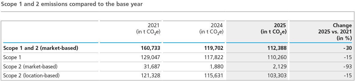The resulting greenhouse gas emissions are presented in the following table. The table also compares Scope 1 and 2 emissions to the base year. As the table shows, the annual interim targets for Scope 1 and 2 were met in 2025, confirming the effectiveness of the measures and projects implemented under the Group’s climate strategy.